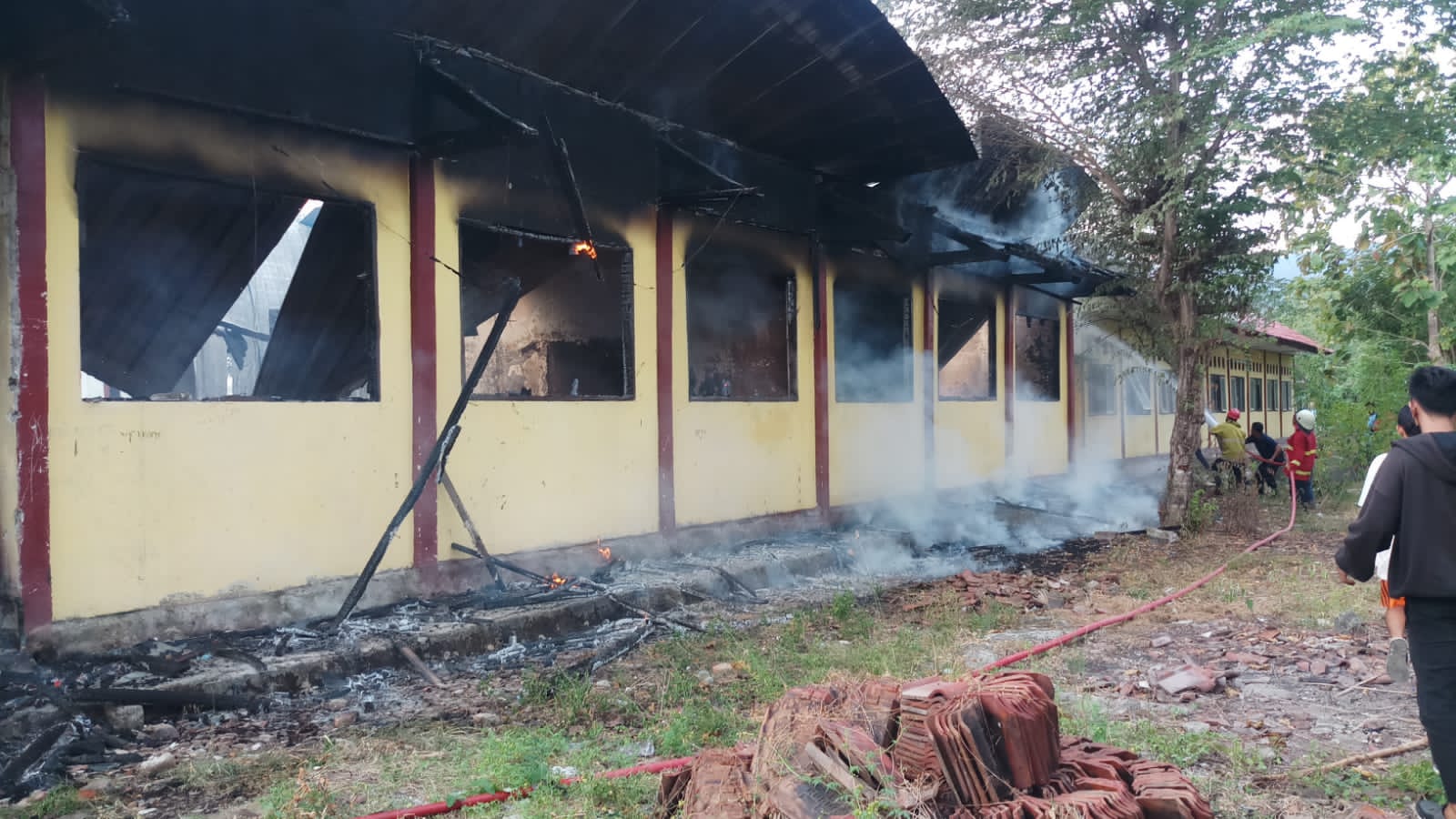 Kebakaran tersebut mengakibatkan lima atap ruang kelas hangus terbakar dan ditaksir kerugiannya ratusan juta rupiah.
