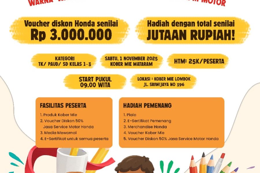 Akhir pekan di Mataram bakal lebih meriah dengan adanya kegiatan seru untuk anak-anak. Kober Mie dan MPM Motor Cabang Mataram berkolaborasi mengadakan ‘Lomba Mewarnai: Warna-Warni Ceria’ pada Sabtu, 1 November 2025. Acara ini akan berlangsung di Kober Mie Mataram, Jl. Sriwijaya No. 396.